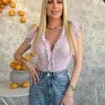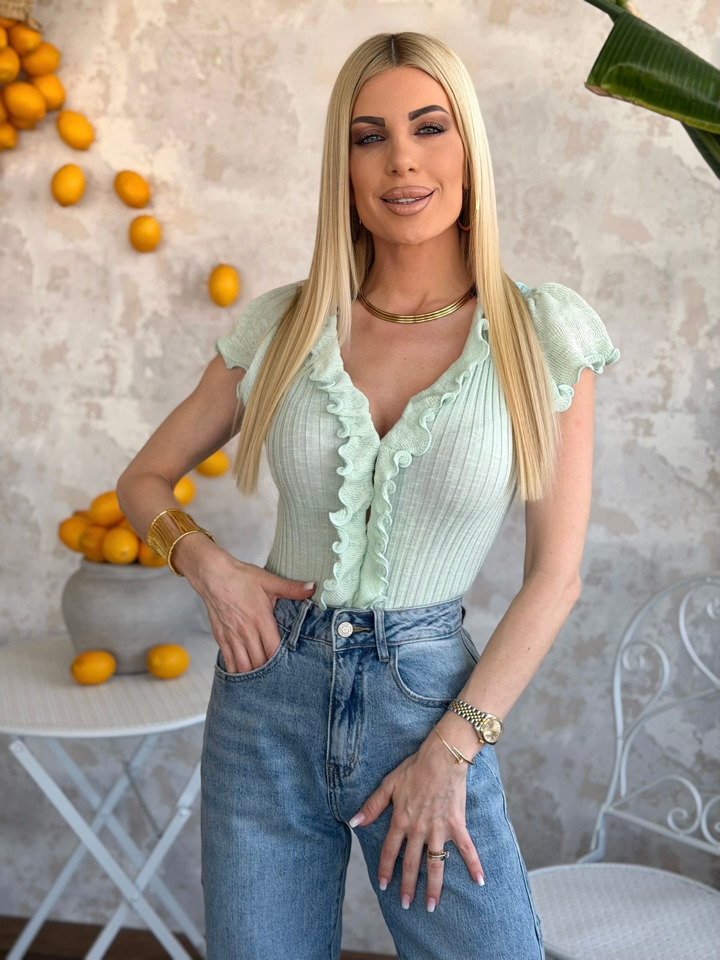 Ζακέτα πλεκτή ελαστική με βολά, κλείνει με κουμπάκια.