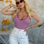 Ολόσωμο μαγιό με V στο στήθος, με χαμηλή πλάτη, αυξομειώμενες ράντες που δένουν στην πλάτη, με κανονικό κόψιμο στο πίσω μέρος, διαθέτει cups που αφαιρούνται. Στενή εφαρμογή, προτιμήστε ένα νούμερο μεγαλύτερο. Στα μαγιό δεν γίνονται αλλαγές – επιστροφές για λόγους υγιεινής.