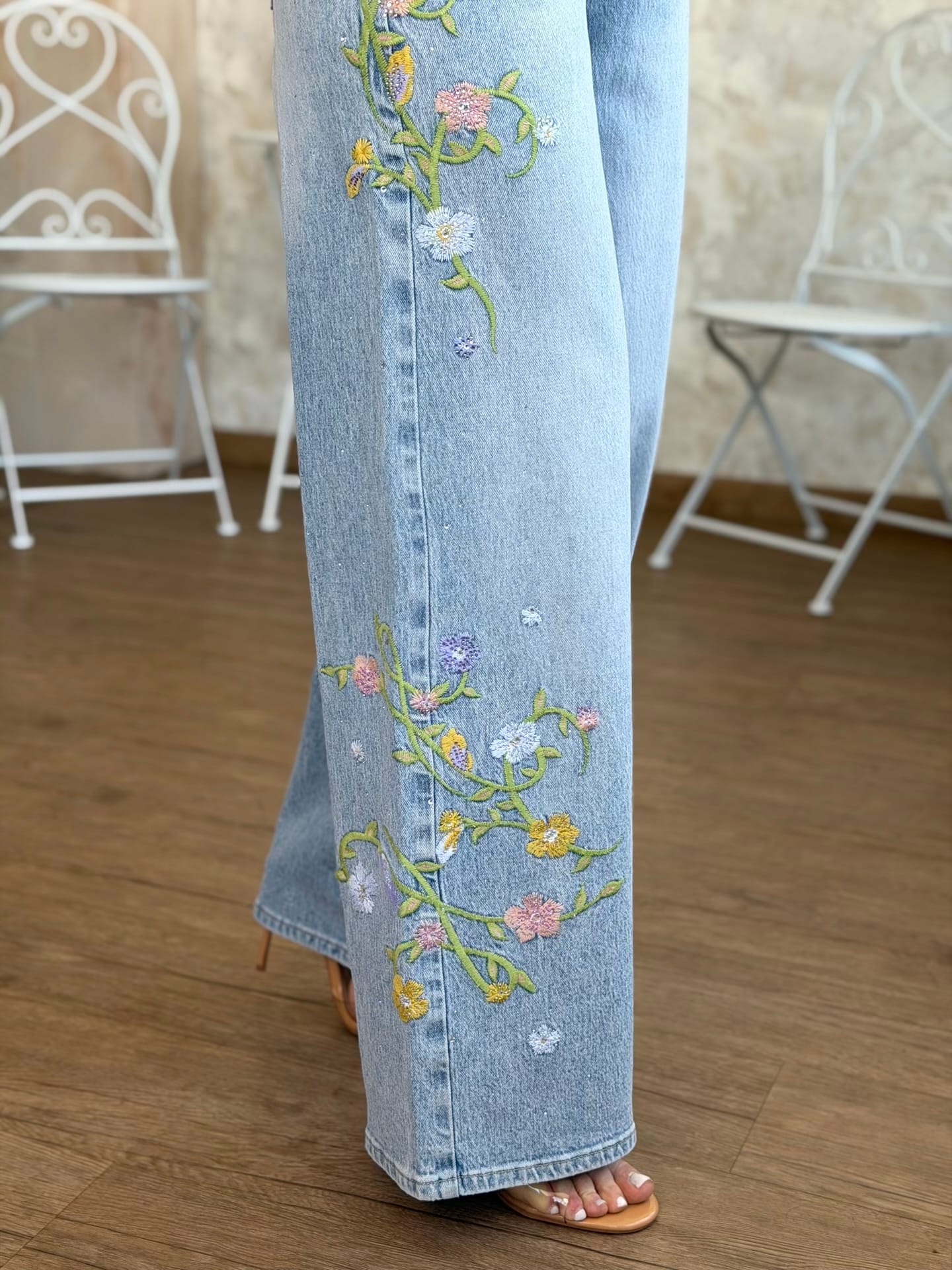 Παντελόνι τζιν ψηλόμεσο, ελαστικό με τσέπες μπροστά και πίσω, κεντήματα στο πλάϊ και στρας. Το παντελόνι είναι σε προσφορά και δεν γίνεται αλλαγή – επιστροφή.