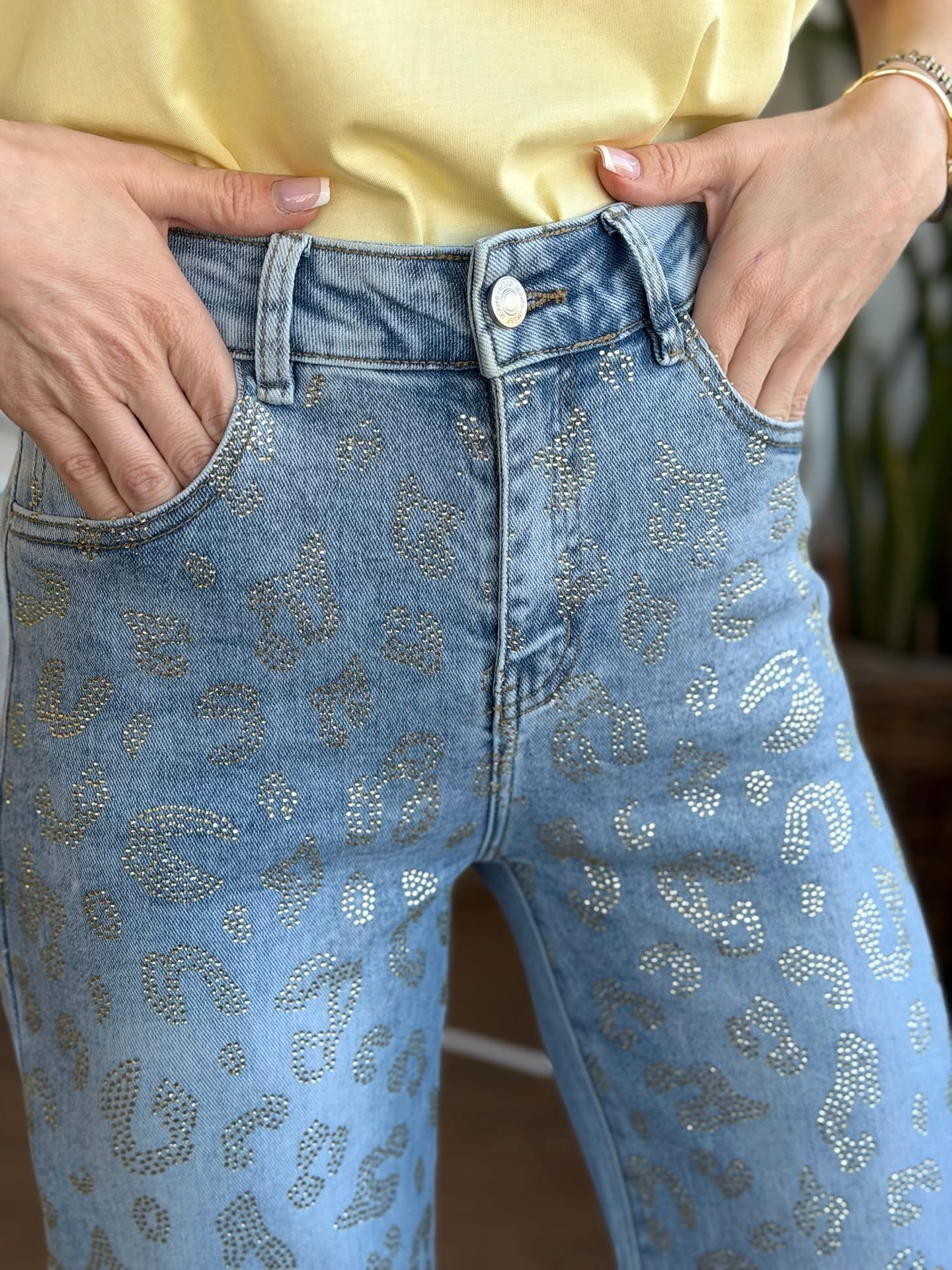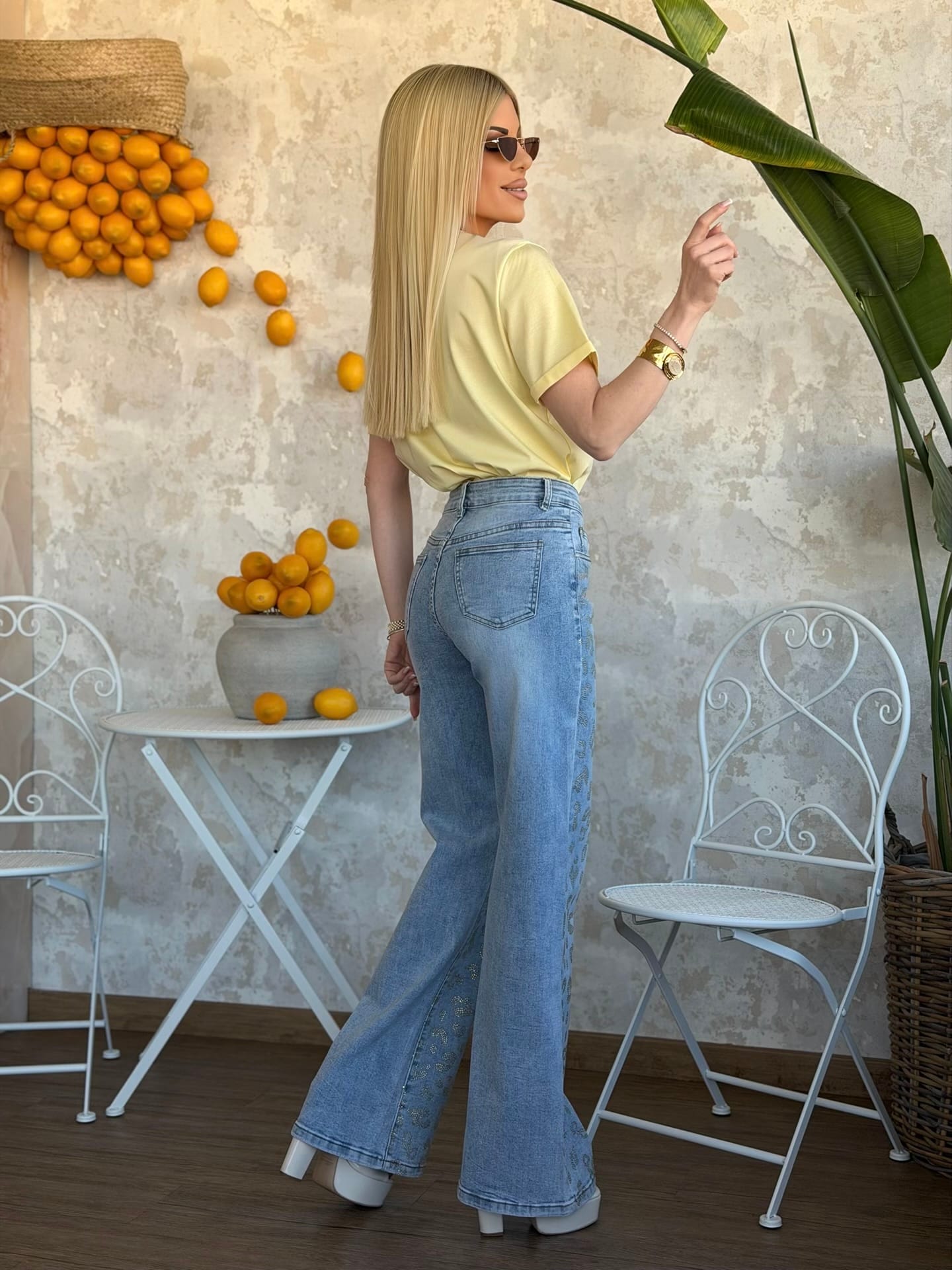 Παντελόνι τζιν ψηλόμεσο, ελαστικό, διαθέτει διακοσμητικά στρας. Το παντελόνι είναι σε προσφορά και δεν γίνεται αλλαγή – επιστροφή.