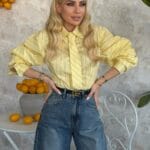 Πουκάμισο με λευκή ρίγα σε άνετη γραμμή, στα μανίκια διαθέτει διακοσμητική δαντέλα.