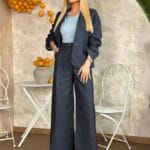 Σετ κοστούμι με σακάκι φοδραρισμένο, με διακοσμητική τσέπη, κλείνει σταυρωτά με ζώνη, διαθέτει βάτες και παντελόνι με λάστιχο στη μέση, τσέπες στο πλάϊ. Το σετ είναι σε προσφορά και δεν γίνεται αλλαγή – επιστροφή.