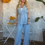 Σετ κοστούμι σε κανονική γραμμή, με γιλέκο αμάνικο, φοδραρισμένο, διαθέτει διακοσμητικές τσέπες, κλείνει με ένα κουμπί, διαθέτει ζών και παντελόνι με τσέπες στο πλάϊ, κλείνει με κουμπί και φερμουάρ, διαθέτει λάστιχο στη μέση στο πίσω μέρος.  Το σετ είναι σε προσφορά και δεν γίνεται αλλαγή – επιστροφή.