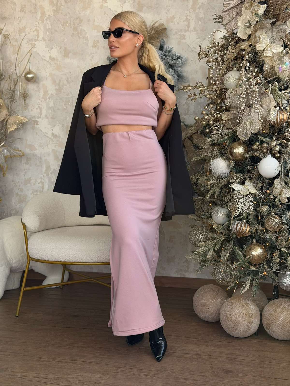 Σετ με μπούστο ελαστικό, με αυξομειώμενες τιράντες και φούστα με λάστιχο στη μέση και άνοιγμα στο πλάϊ.