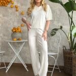 Σετ πλεκτό με κοντομάνικη μπλούζα με γιακά, με ρίγες στην ύφανση και παντελόνι με λάστιχο στη μέση. Το σετ είναι σε προσφορά και δεν γίνεται αλλαγή – επιστροφή.
