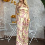Σετ με γιλέκο crop με βάτες στους ώμους, κλείνει σταυρωτά με κουμπιά, διαθέτει διακοσμητικές τσέπες και φούστα – σορτς με διακοσμητικό κουμπί, κλείνει πλάγια με φερμουάρ. Το σετ είναι σε προσφορά και δεν γίνεται αλλαγή – επιστροφή.