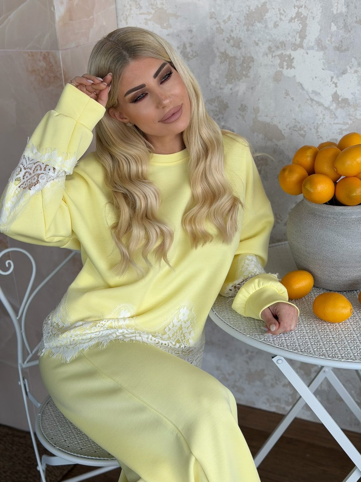 Σετ φόρμας με μπλούζα σε άνετη γραμμή, με λευκή δαντέλα στο τελείωμα της μπλούζας και στα μανίκια και παντελόνι με λάστιχο στη μέση και κορδόνι. Το σετ είναι σε προσφορά και δεν γίνεται αλλαγή – επιστροφή.