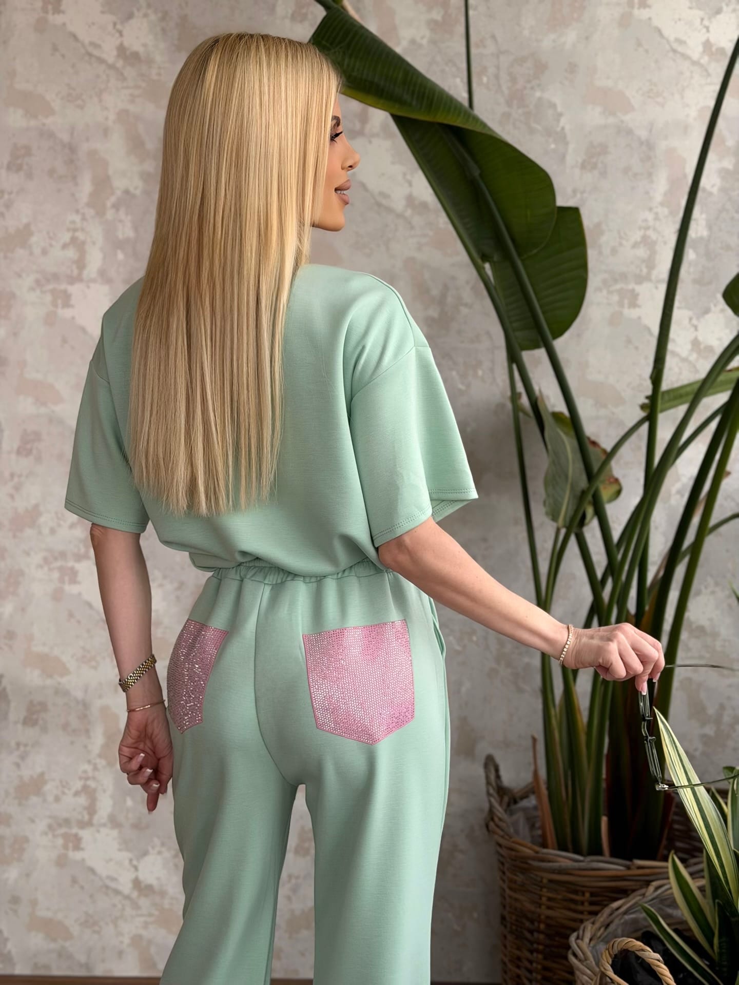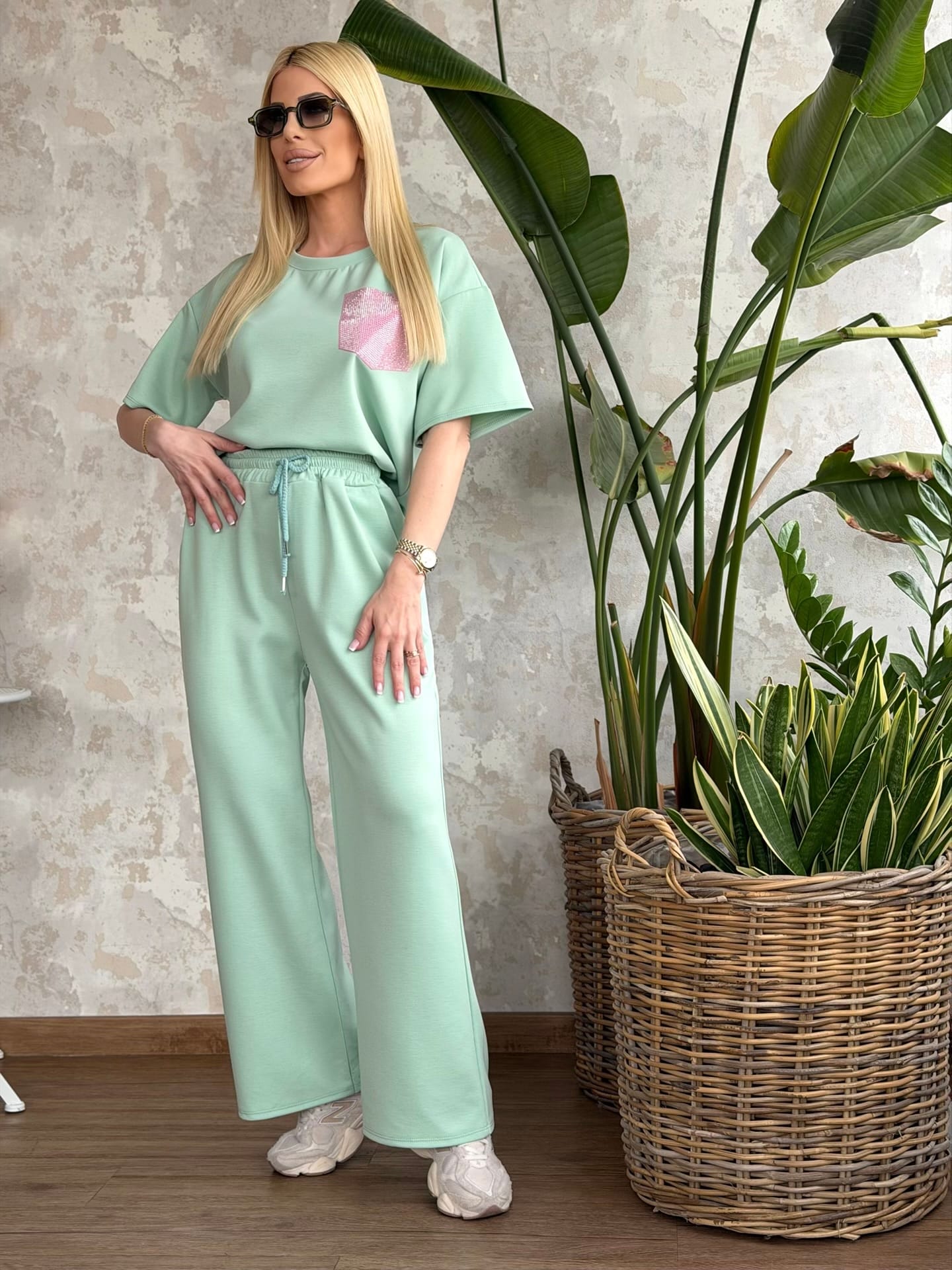Σετ φούτερ εποχής με t-shirt σε άνετη γραμμή και διακοσμητική τσέπη και παντελόνι με λάστιχο στη μέση και τσέπες. Το σετ είναι σε προσφορά και δεν γίνεται αλλαγή – επιστροφή.