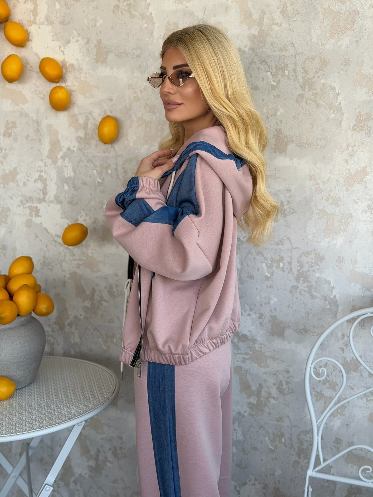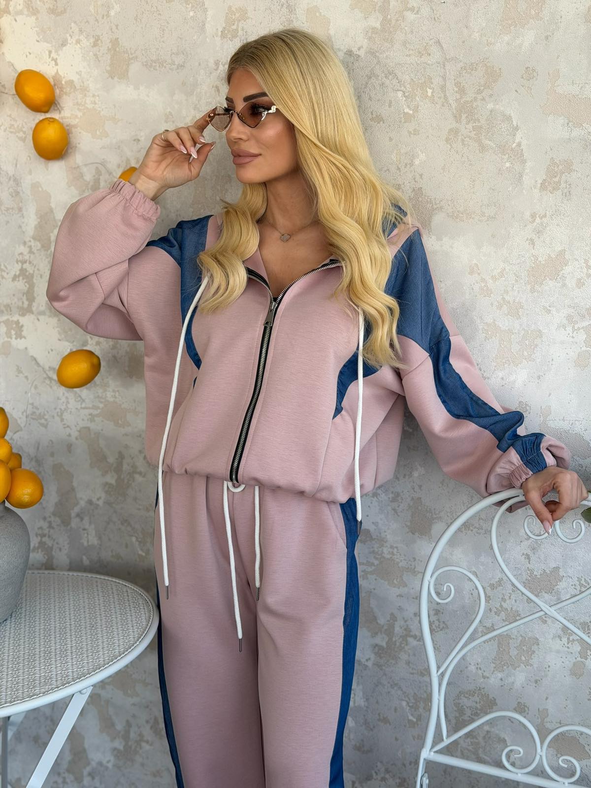 Σετ με ζακέτα σε άνετη γραμμή, με τζιν λεπτομέρεια, κλείνει με φερμουάρ και διαθέτει κουκούλα, λάστιχο στο κάτω μέρος και παντελόνι με λάστιχο στη μέση, τσέπες και ρίγα στο πλάϊ.