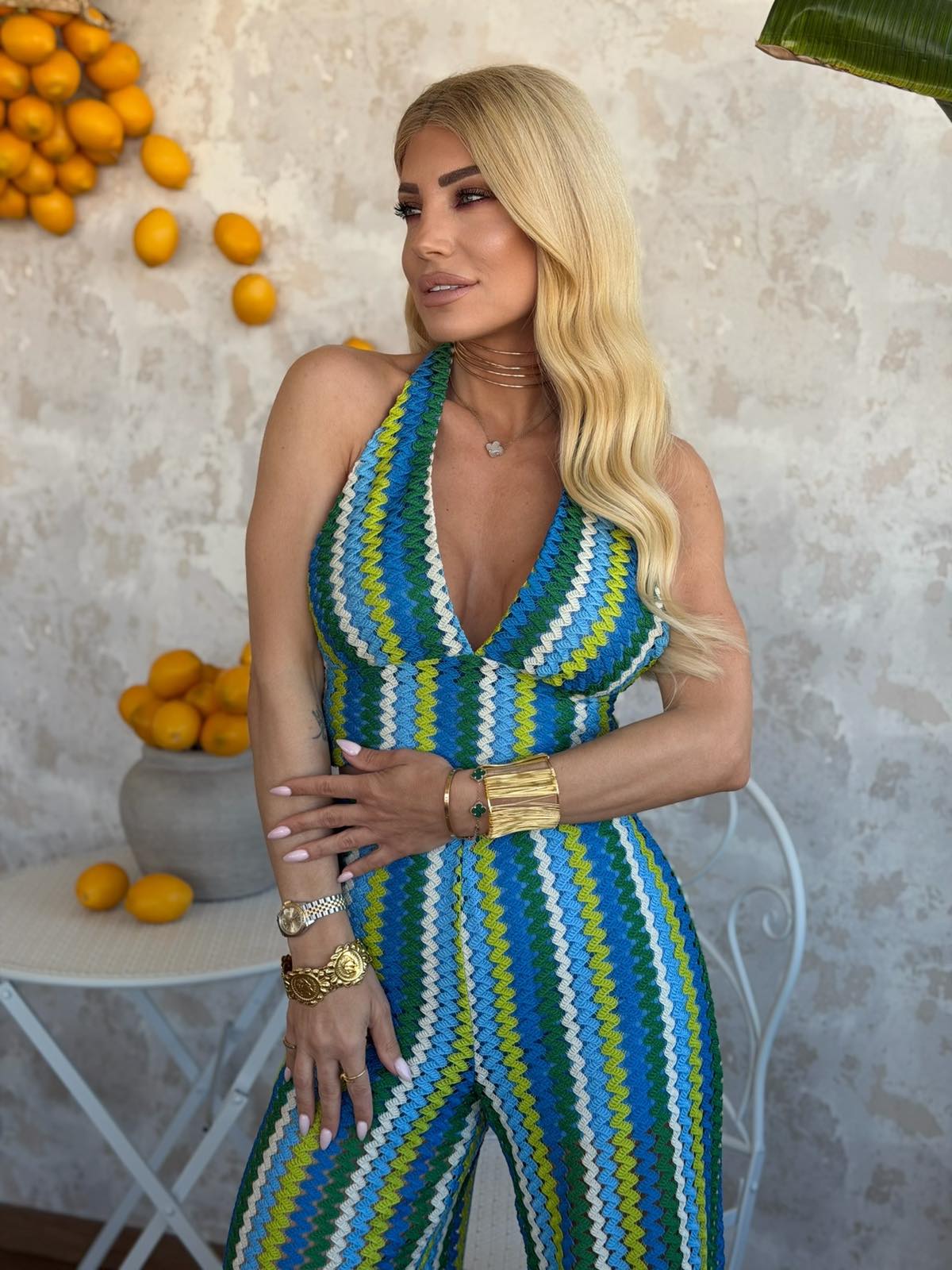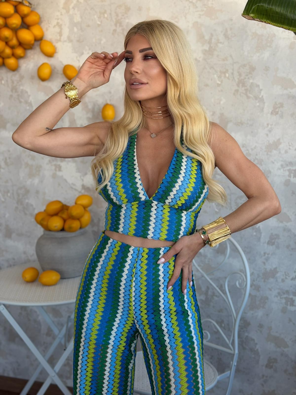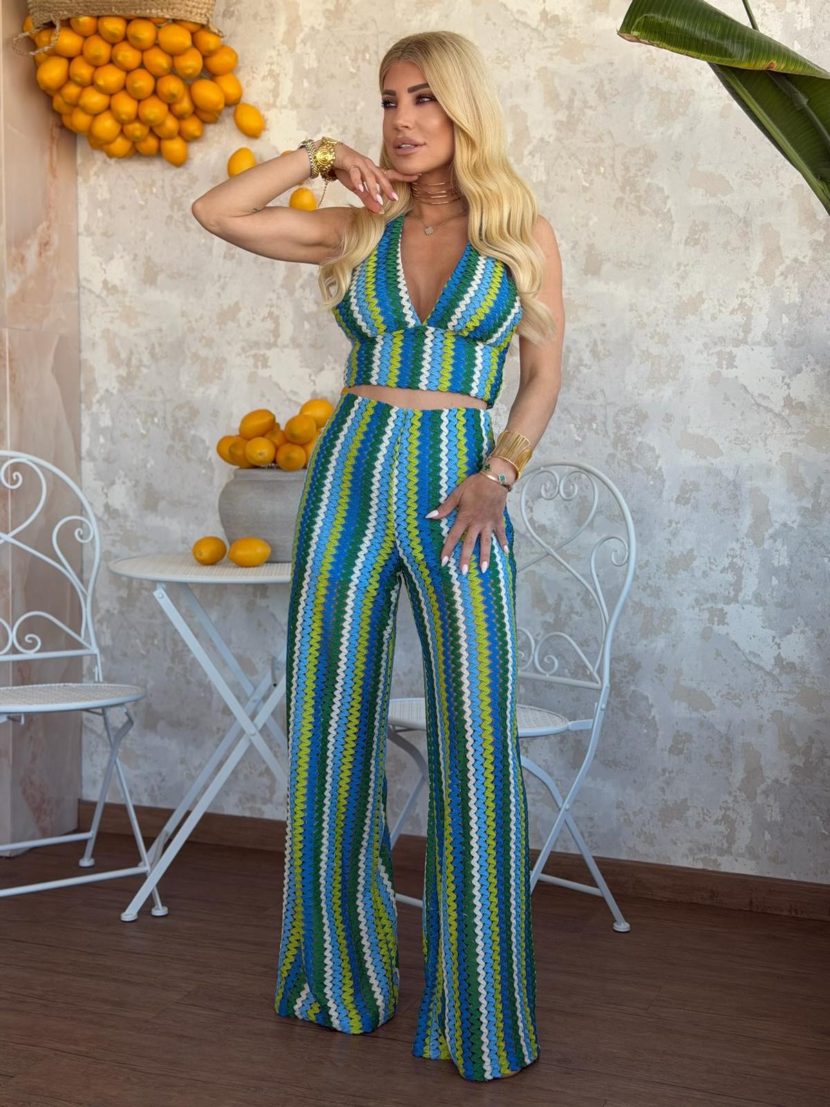 Σετ με crop top με δέσιμο στο λαιμό με ροζ φόδρα εσωτερικά και παντελόνι με λάστιχο στη μέση και φόδρα σορτς εσωτερικά. Το σετ είναι σε προσφορά και δεν γίνεται αλλαγή – επιστροφή.