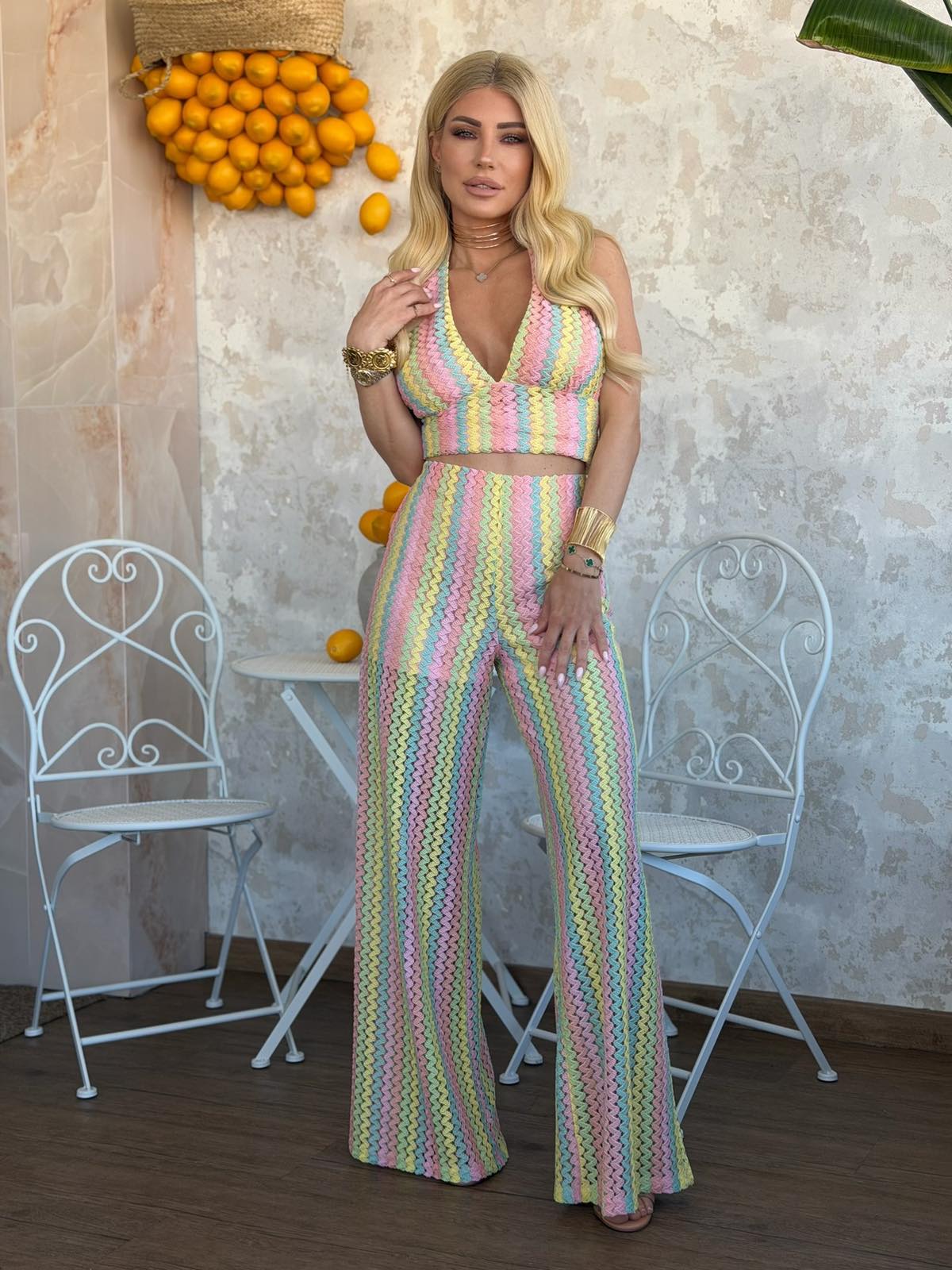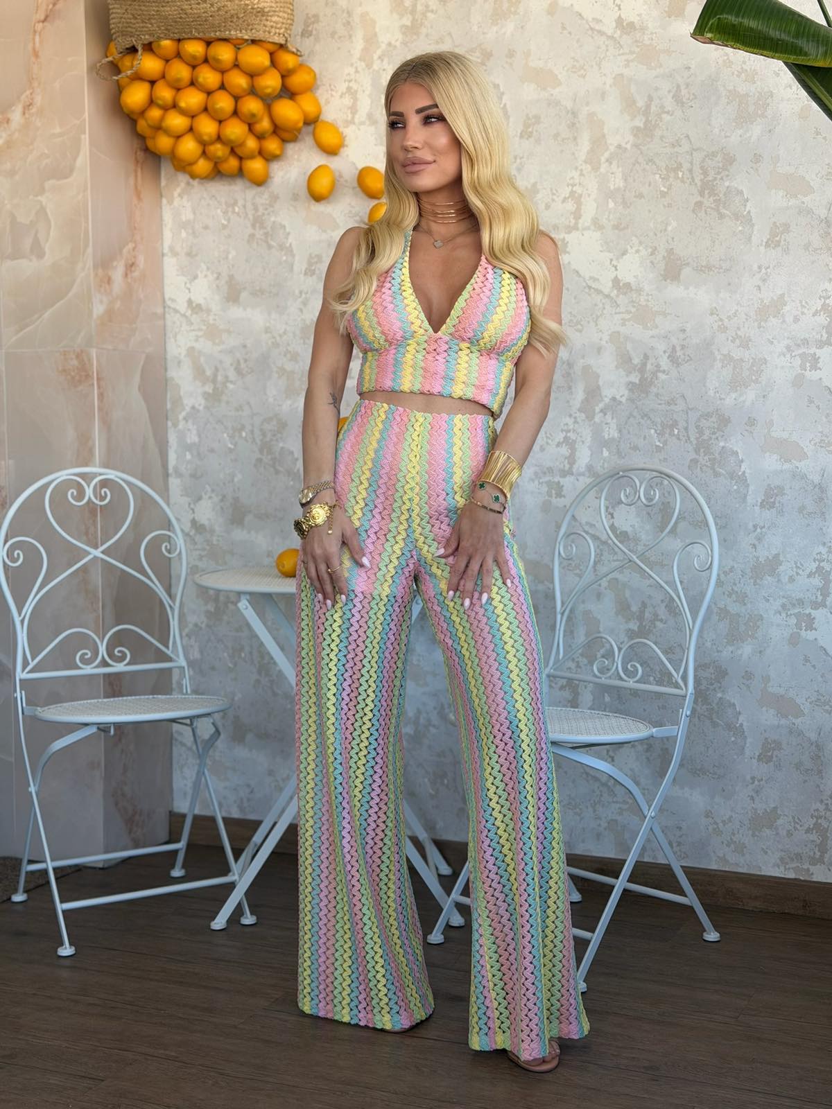 Σετ με crop top με δέσιμο στο λαιμό με ροζ φόδρα εσωτερικά και παντελόνι με λάστιχο στη μέση και φόδρα σορτς εσωτερικά. Το σετ είναι σε προσφορά και δεν γίνεται αλλαγή – επιστροφή.