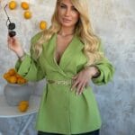 Τζάκετ σε κανονική γραμμή, με μικρή ελαστικότητα, πιέτες στον ώμο, διακοσμητικές τσέπες, χρυσά κουμπιά. Το τζάκετ είναι σε προσφορά και δεν γίνεται αλλαγή – επιστροφή.