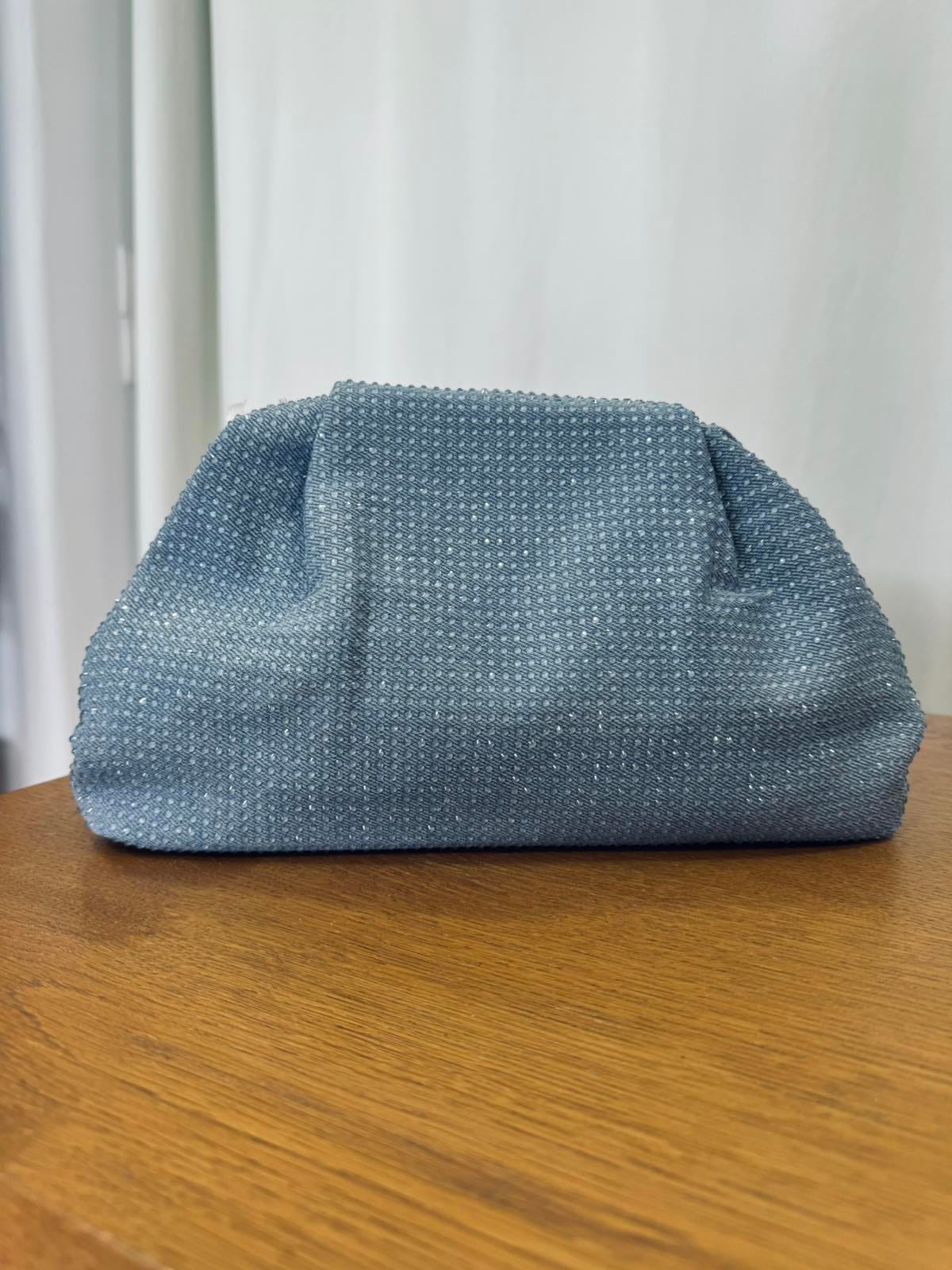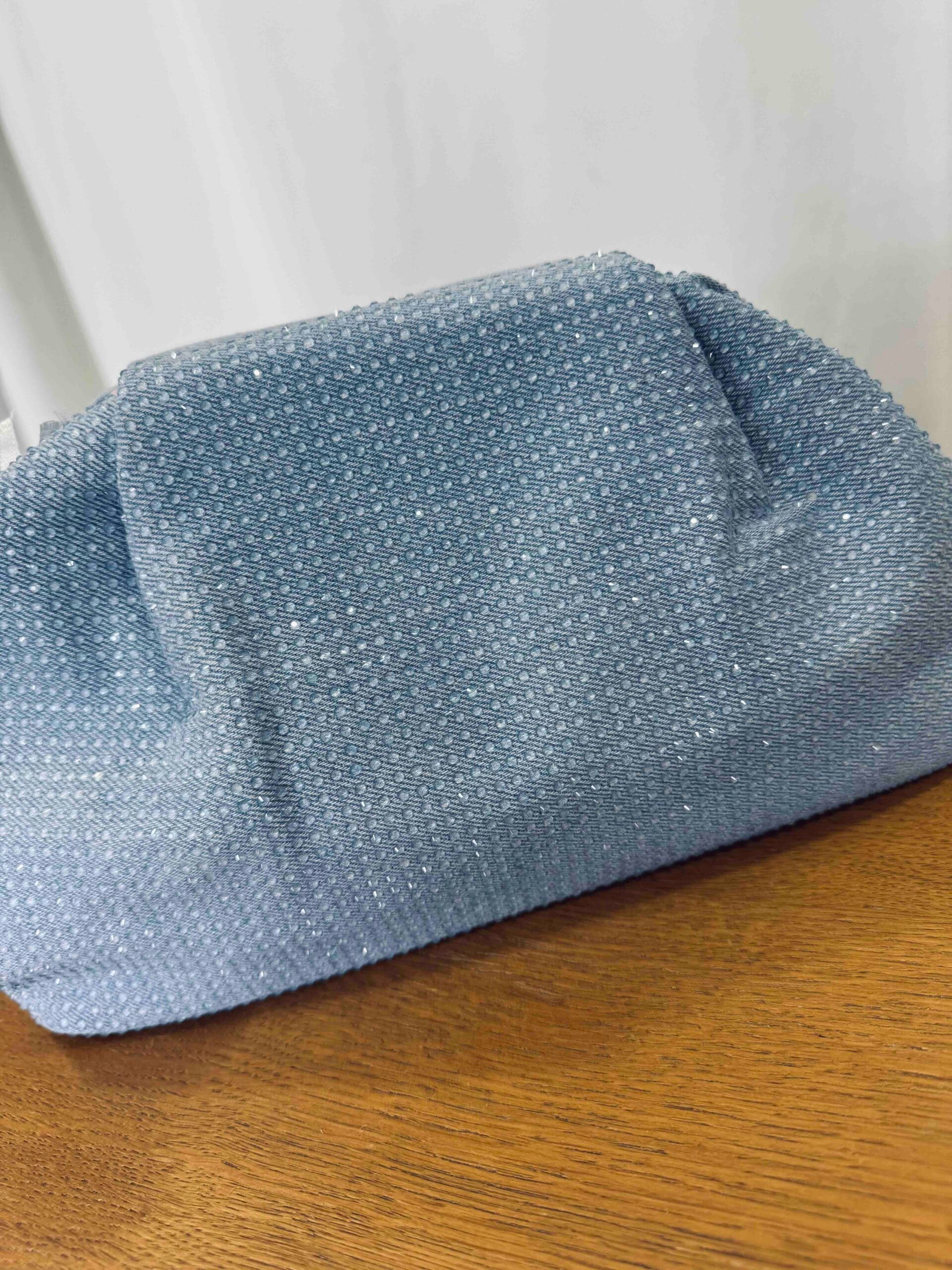 Τσάντα τζιν με στρας, διαθέτει χρυσή αλυσίδα.