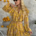 Φόρεμα με βολάν στο μπροστινό μέρος, διαθέτει κορδόνι στο λαιμό και λάστιχο στο τελείωμα στα μανίκια, έχει λάστιχο στη μέση, διαθέτει φόδρα εσωτερικά και ζώνη ίδιας ύφανσης.