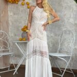 Φόρεμα maxi πλεκτό με αυξομειώμενες τιράντες, διαθέτει φόδρα εσωτερικά, με διακοσμητικό χρυσό στοιχείο, κλείνει στο πλάϊ με φερμουάρ.