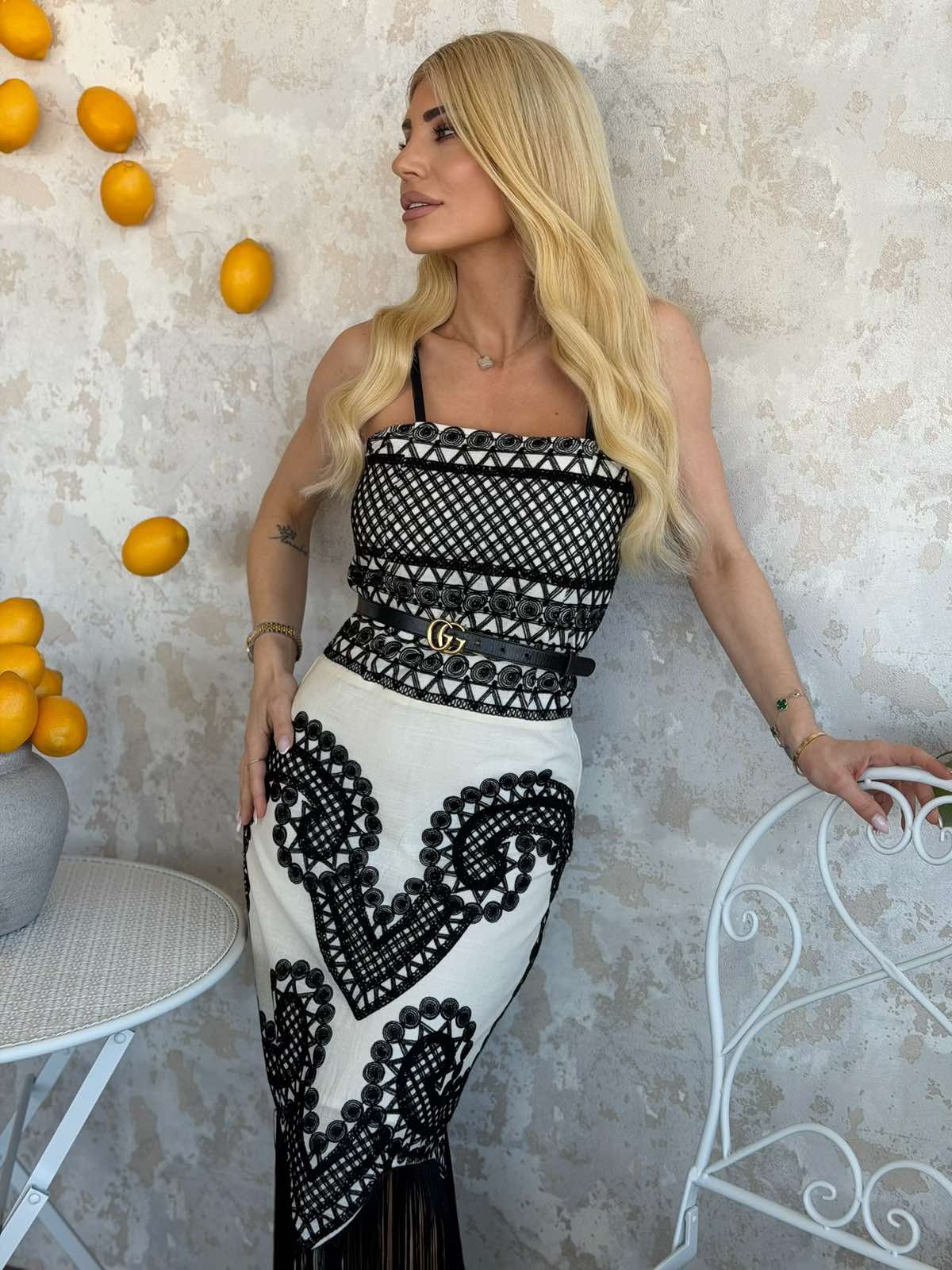 Φόρεμα maxi, με ελαστικό αυξομειώμενο ραντάκι, σφηκοφωλιά και φερμουάρ στο πίσω μέρος, διαθέτει κρόσσια στο τελείωμα και φόδρα εσωτερικά.