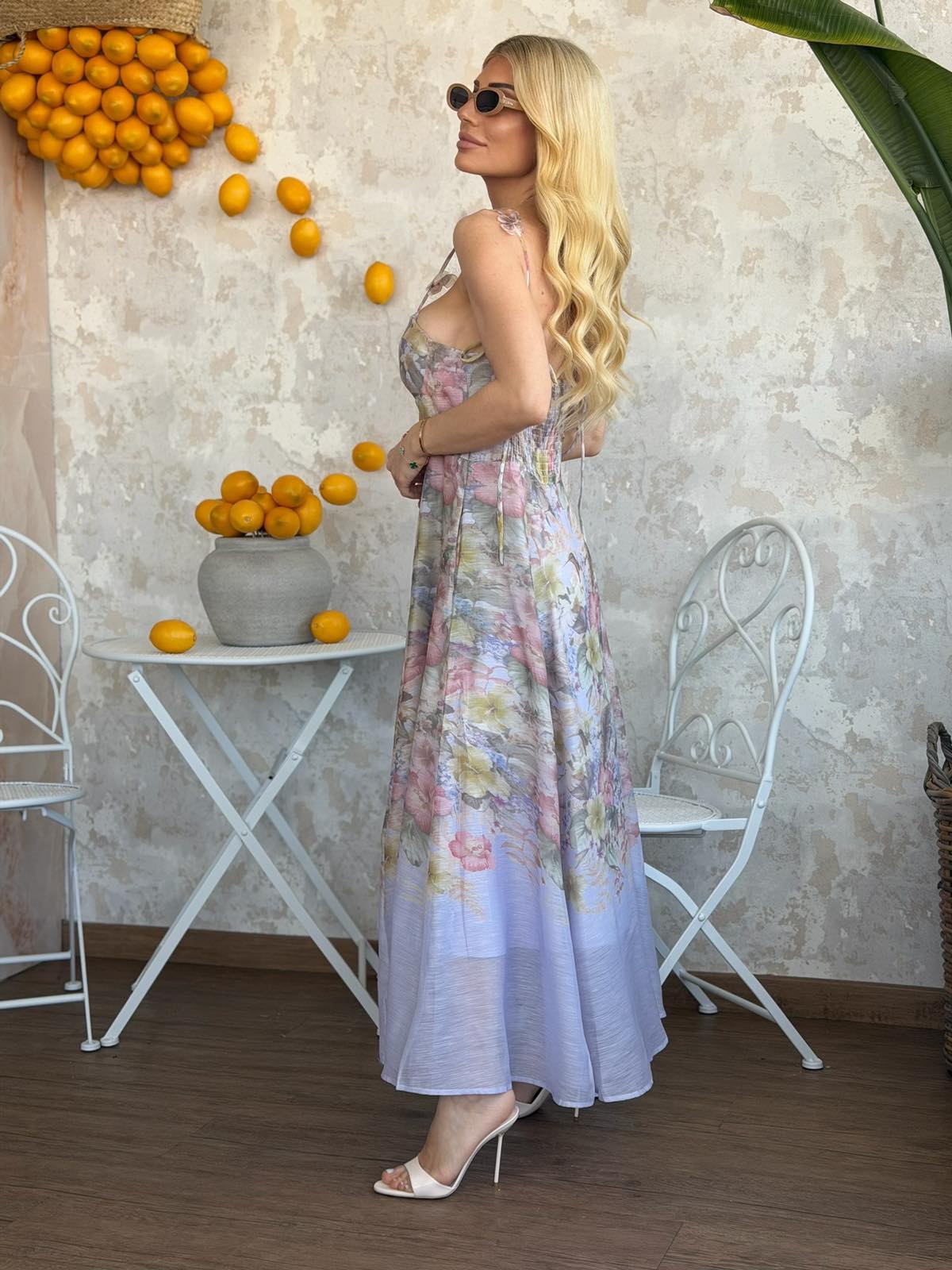 Φόρεμα maxi σε κανονική γραμμή, τιράντα με δέσιμο και πεταλούδες, σφηκοφωλιά στο πίσω μέρος, φερμουάρ στο πλάϊ, διαθέτει cups στο στήθος. Το φόρεμα είναι σε προσφορά και δεν γίνεται αλλαγή – επιστροφή.