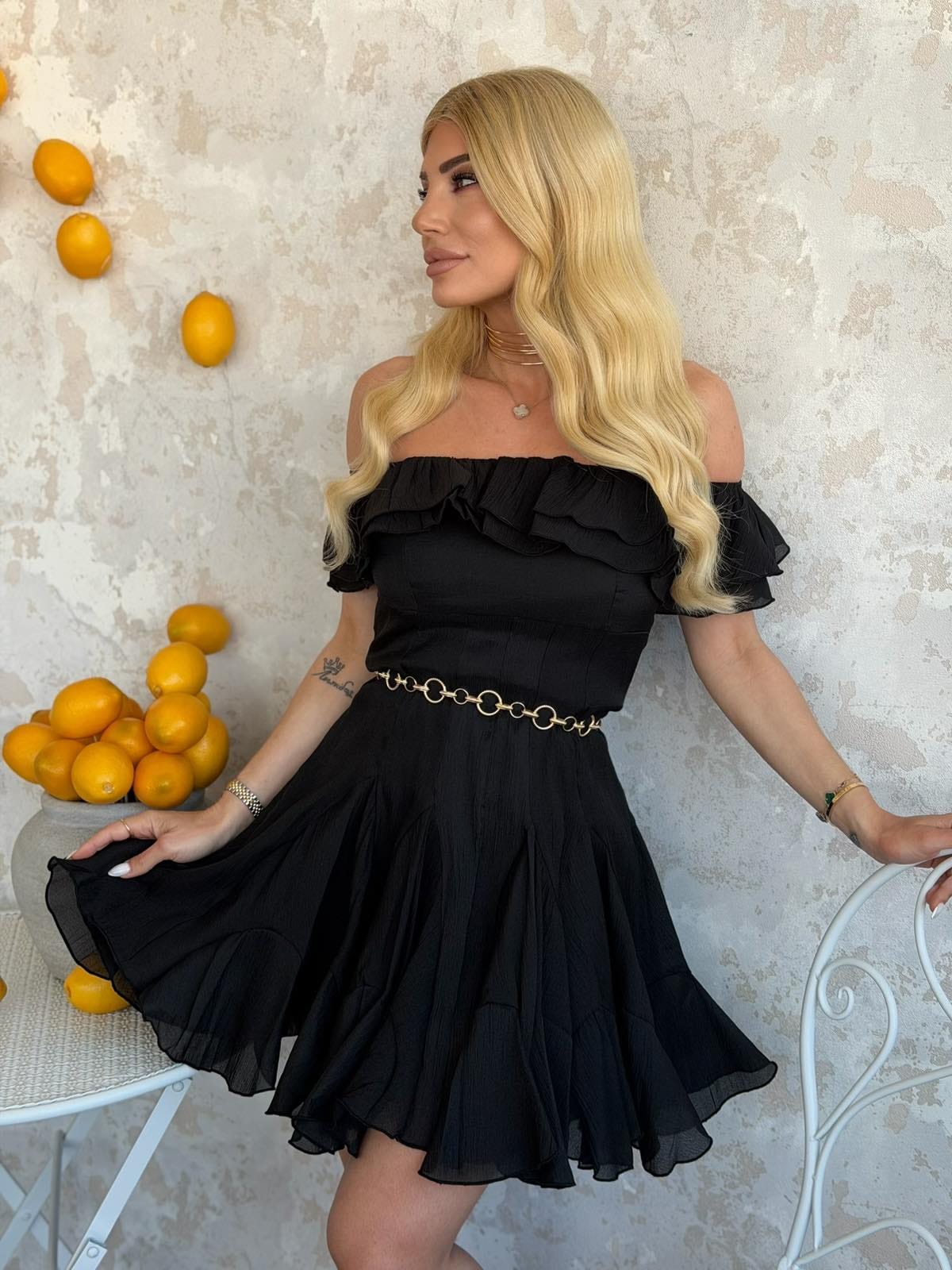 Φόρεμα mini σε Α γραμμή, με έξω ώμους, διαθέτει φόδρα εσωτερικά, κλείνει με φερμουάρ στο πίσω μέρος.